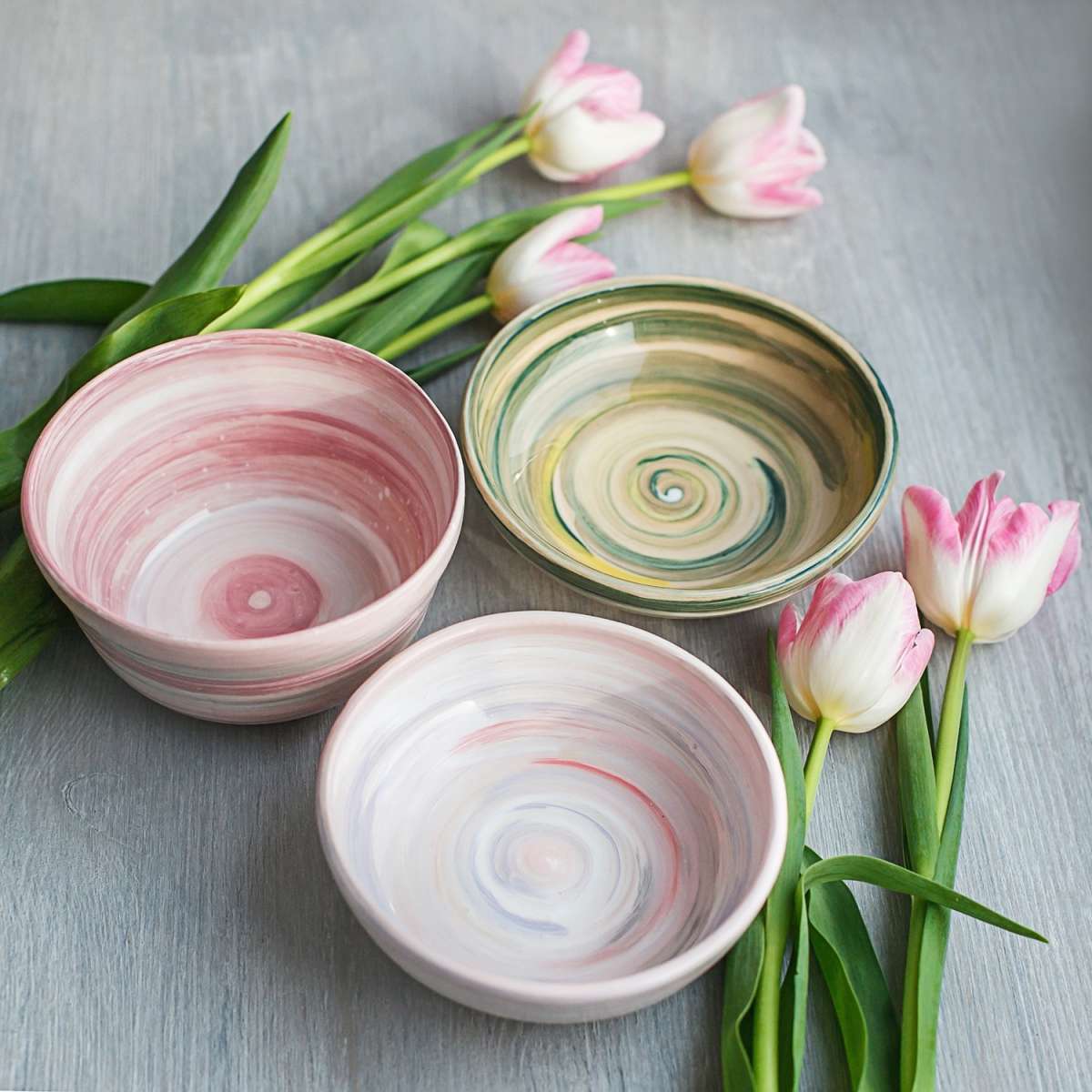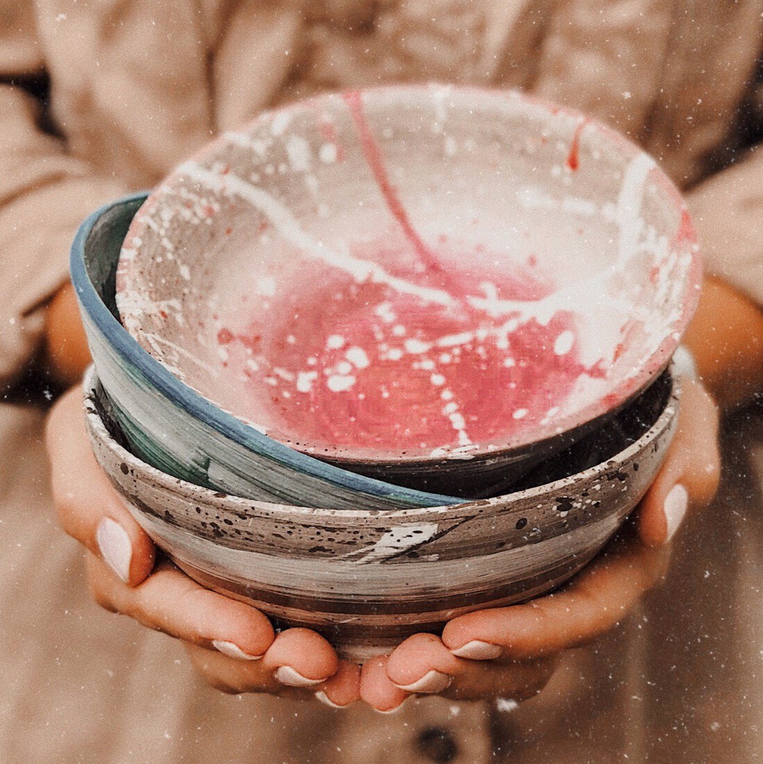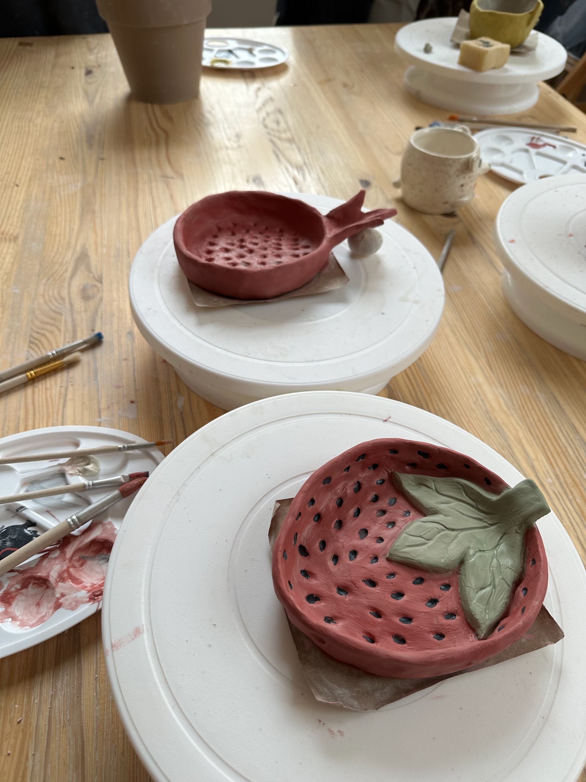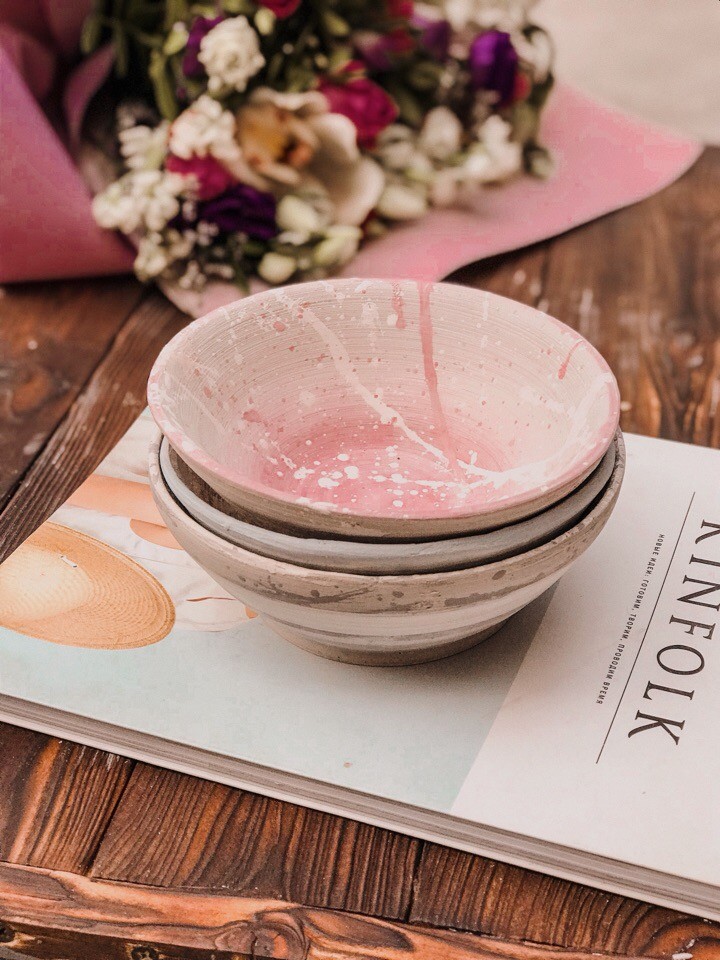 На мастер-классе мы выкручиваем на круге миску, немного ее подсушиваем и сразу расписываем ангобами (краска на основе глины). У нас в палитре есть и нежные нюдовые оттенки и яркие, так что вы точно выберете себе цвета по душе :)
